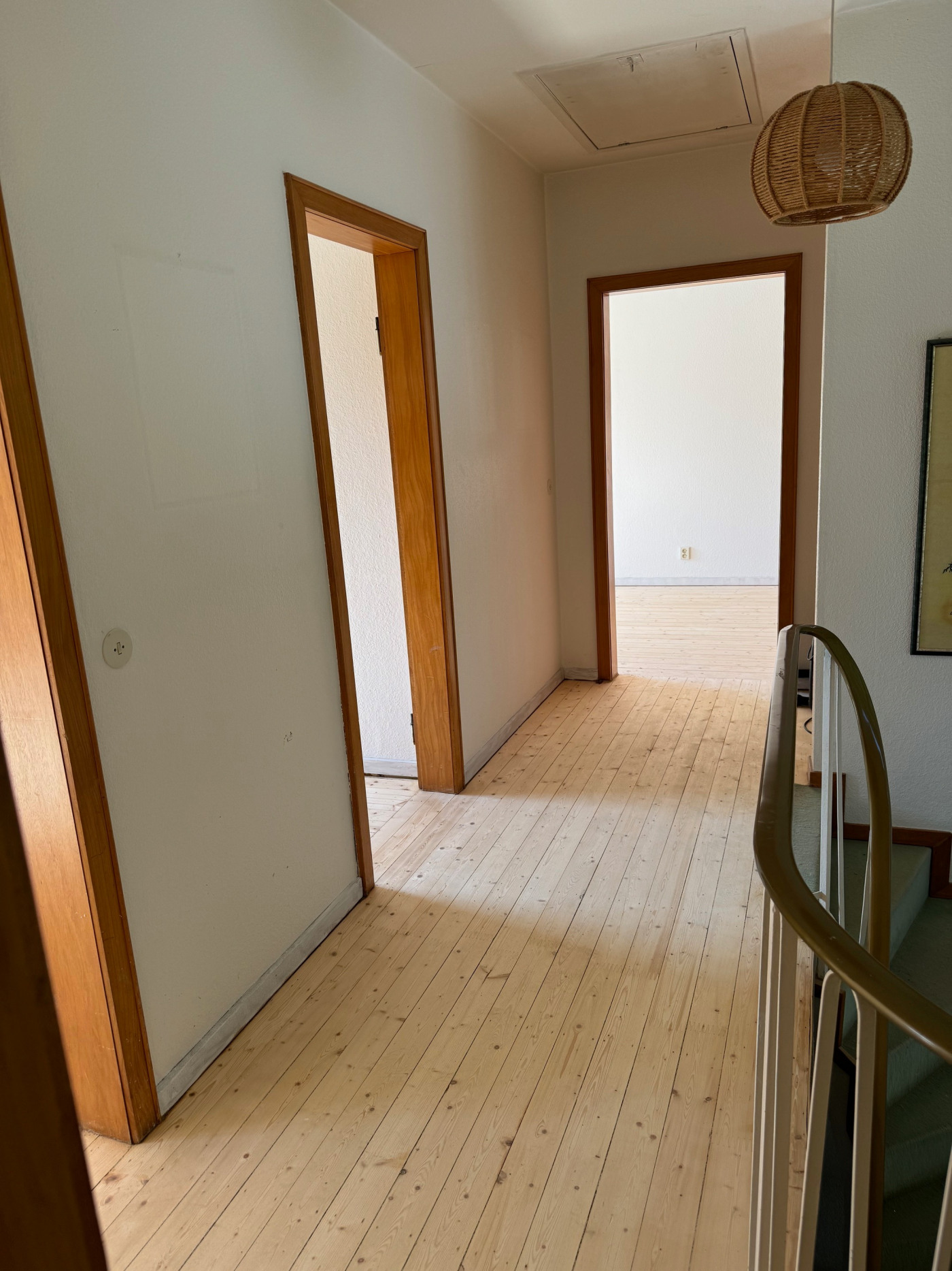 Obergeschoss: Flur, Badezimmer mit Dusche / Wc / Waschbecken / Fenster, Elternschlafzimmer mit Balkonausgang, Kinderzimmer I, Kinderzimmer II mit Balkonausgang.